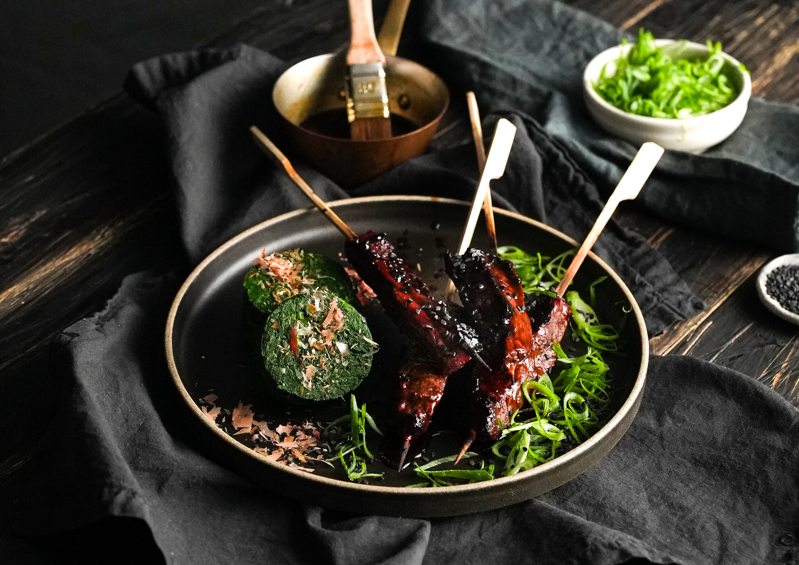 • Cook the skewers over moderate coal, then brush with some of the sauce. Serve with slices of spinach, the remaining sauce, green shallots and sesame seeds.